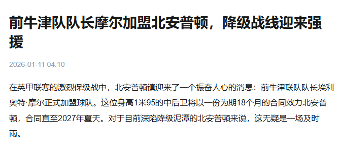 总之,摩尔的加盟无疑是北安普顿在本赛季保级战线上的重要一步。这位拥有丰富经验的中后卫将为球队注入新的活力,为北安普顿的球迷带来更多希望。未来的赛场上,我们期待摩尔用他的表现证明,这笔转会绝对物超所值。